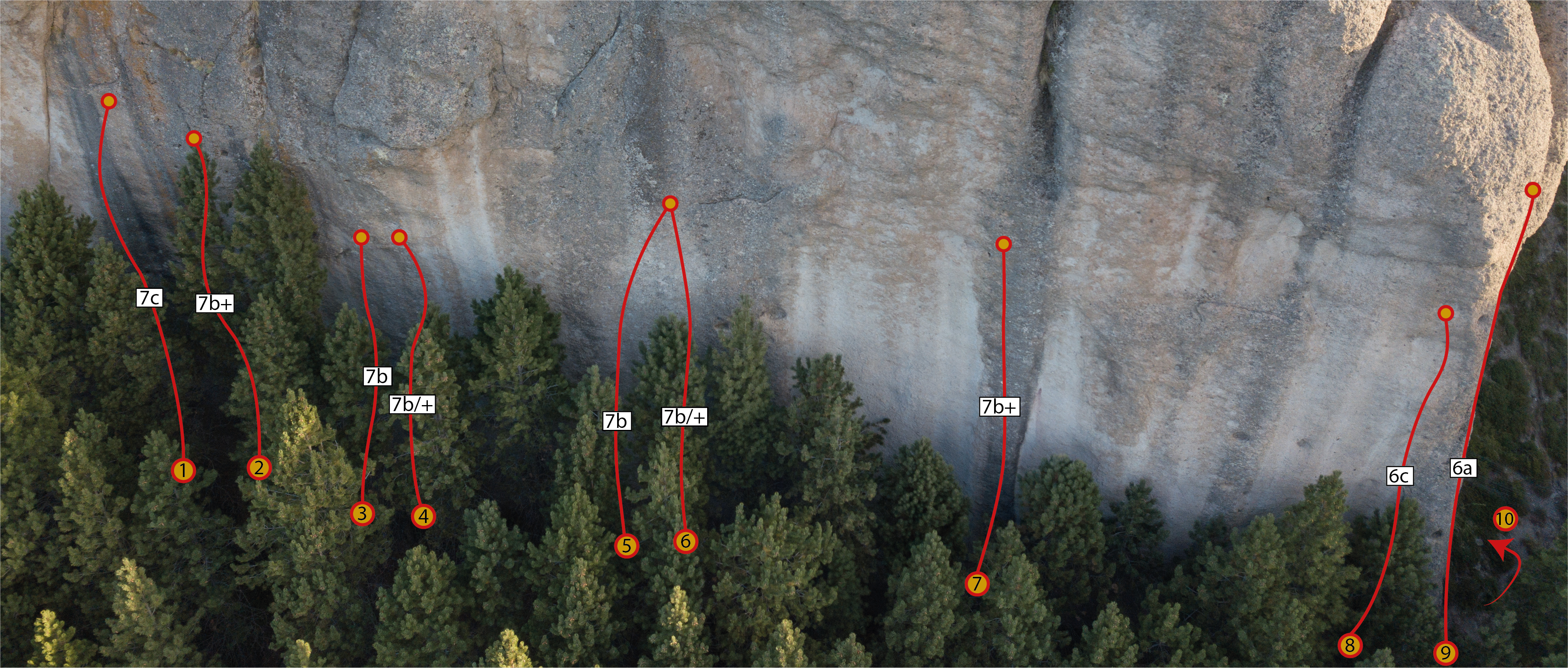 Al llegar a la pared se puede ir hacia la derecha para escalar la vía #7 o ir hacia la izquierda para llegar a las vías #1 a #6.